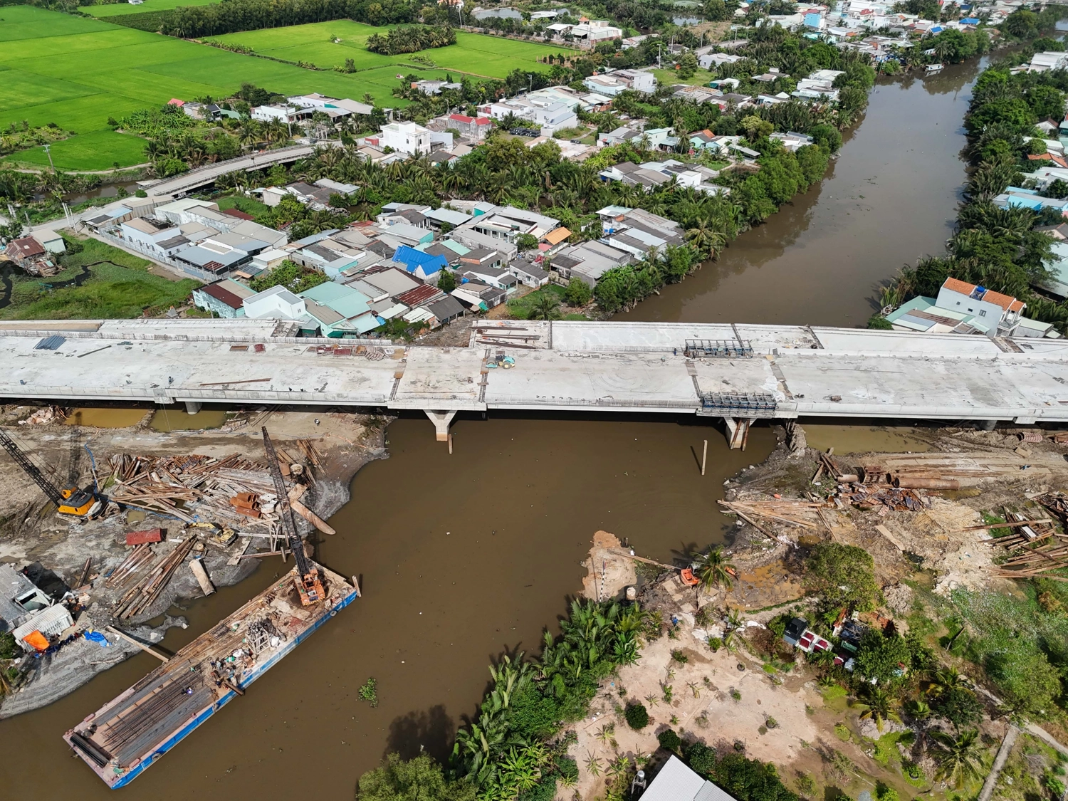 Cầu trên tuyến Vành đai 3 bắc qua sông Bến Lức đã hoàn thiện căn bản, xong phần bêtông bề mặt, đang thi công lan can, chiếu sáng, thảm nhựa.