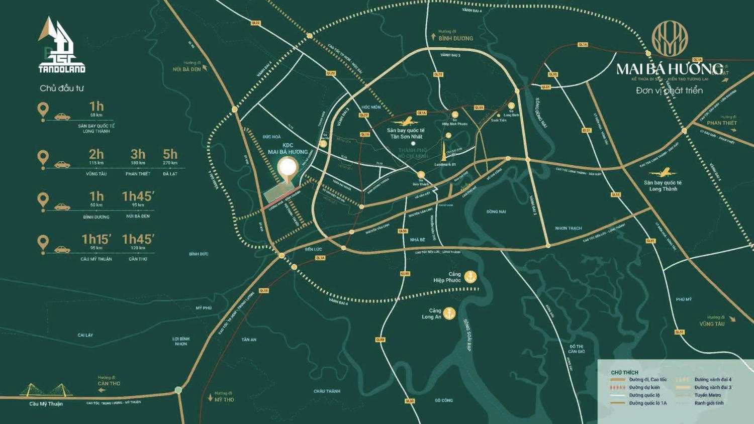 Nằm trên trục giao thông quan trọng, giúp cư dân dễ dàng di chuyển đến trung tâm TPHCM chỉ trong khoảng 30 phút. Từ dự án, bạn có thể nhanh chóng kết nối với các tuyến đường lớn như cao tốc TP.HCM – Trung Lương, quốc lộ 1A, hay đường Vành đai 4. Vị trí này giúp người dân vừa có thể sinh sống trong môi trường yên bình của Long An, vừa thuận tiện cho công việc, học tập tại thành phố.